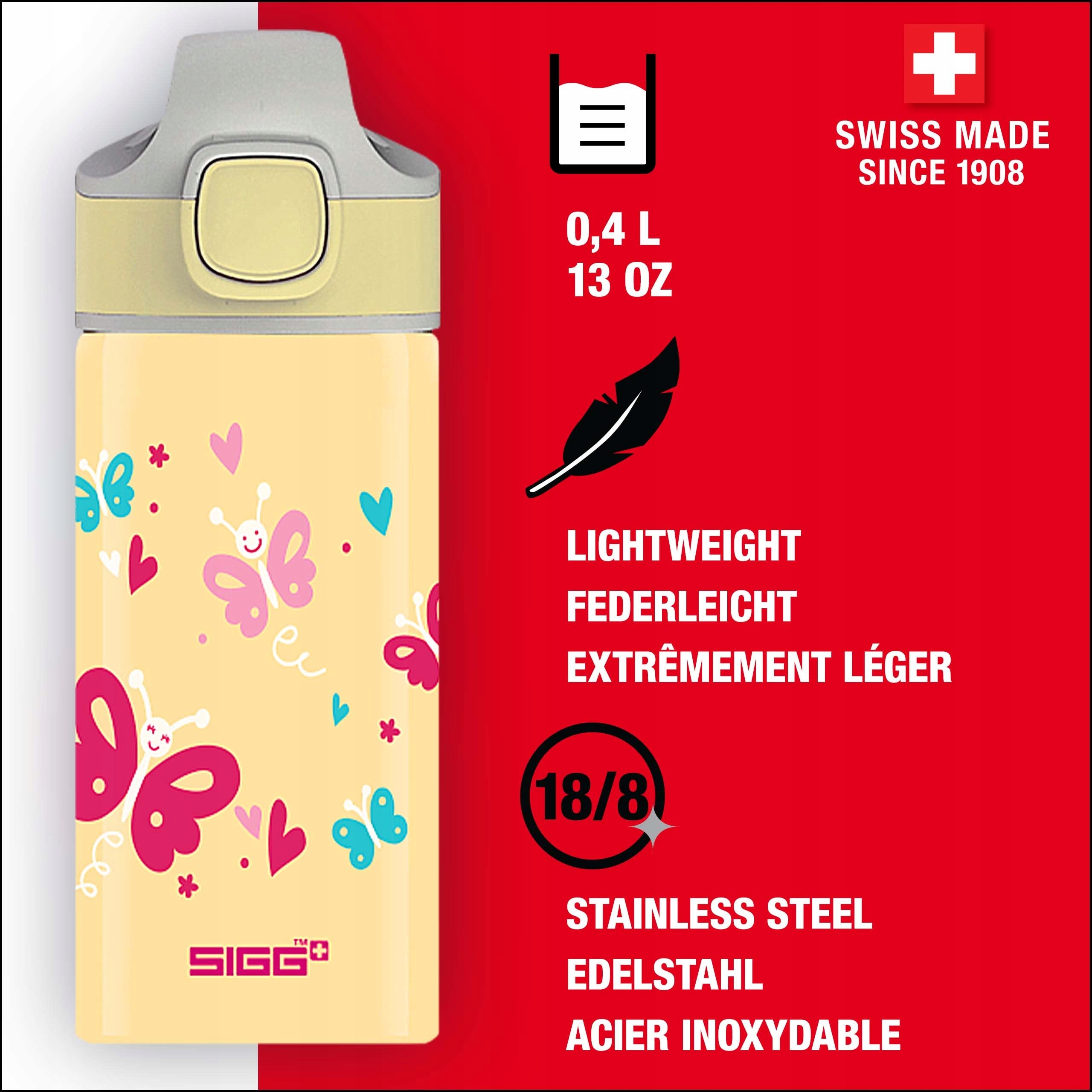 Dzięki materiałowi z którego są wykonane bidony dla dzieci Sigg – wysokiej jakości stal nierdzewna. Wykonano go z jednego kawałka metalu, który w całości można poddać recyklingowi. W większości bidonów Sigg jest specjalny ustnik dla dzieci: KBT, który można łatwo demontować i jest łatwy w czyszczeniu.