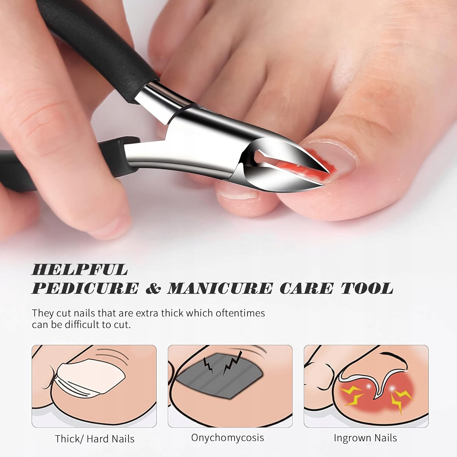 Intymna, antypoślizgowa konstrukcja: teraz możesz cieszyć się miękkim, antypoślizgowym uchwytem, który idealnie pasuje do Twojej dłoni. Opracowaliśmy nasze obcinacze do paznokci do grubych paznokci u stóp ze sprężyną odbojową dla łatwej kontroli. Długie, pokryte gumą uchwyty obcinaczy do paznokci u stóp sprawiają, że każde użycie jest proste.