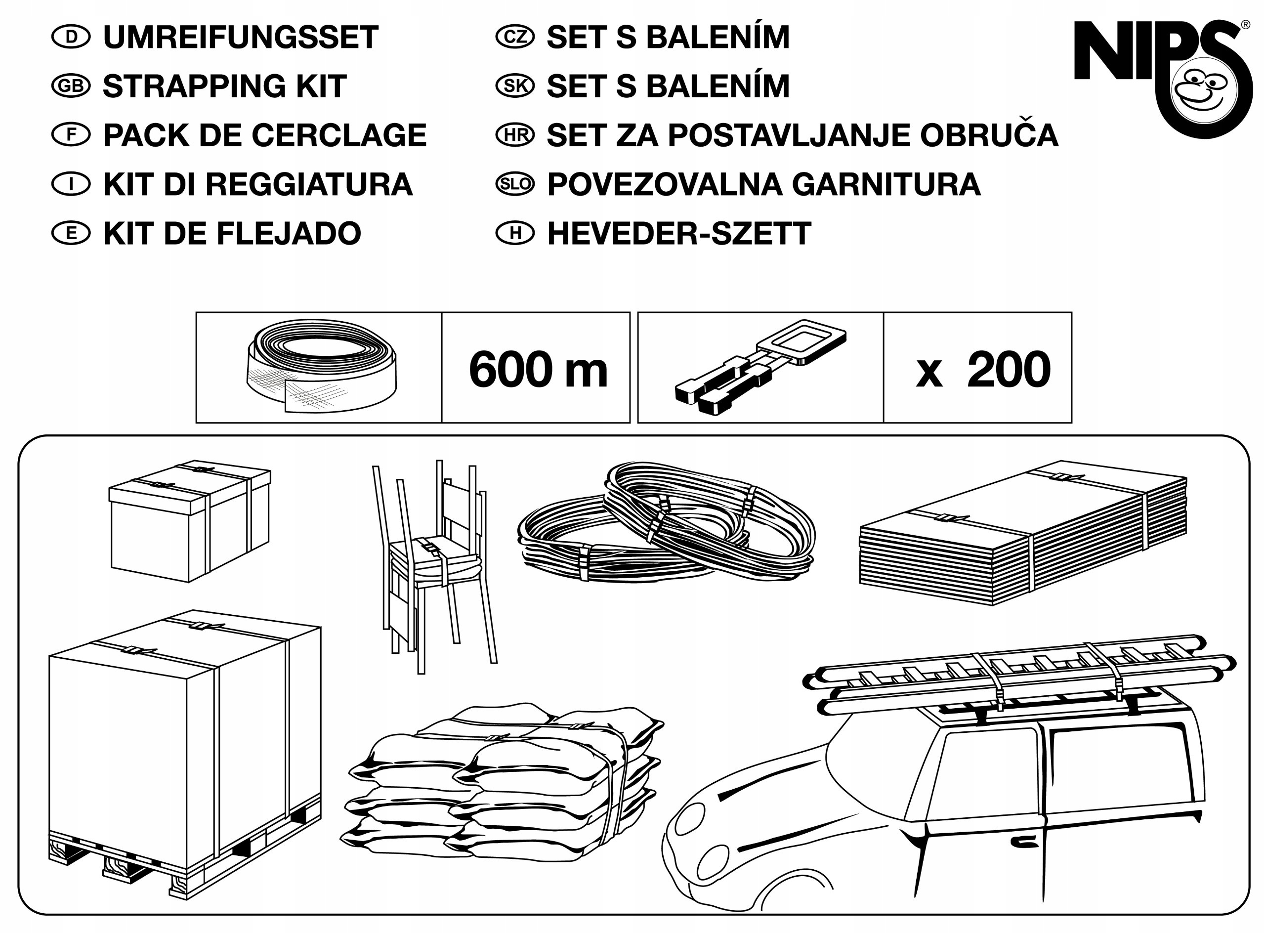 Zawartość: 600 m taśmy oporowej PP (szerokość 12 mm) + 200 sztuk klamerek z polipropylenu